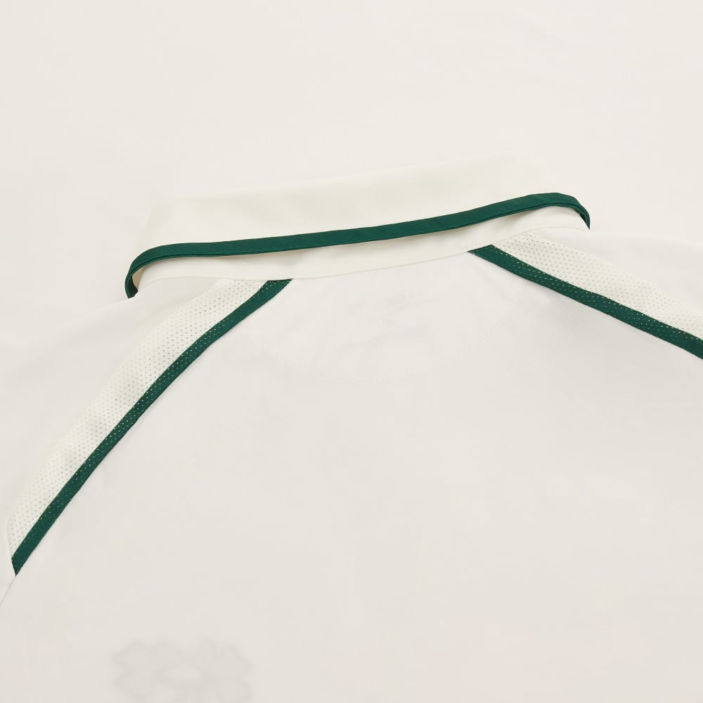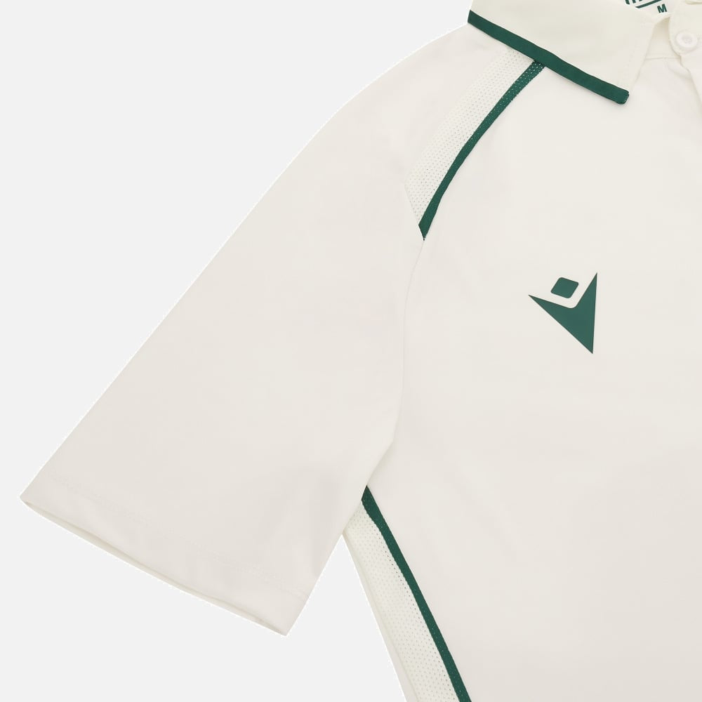 Ireland Cricket Team 2023/24 Test Match Jersey combines simplicity with elegance, featuring an off-white pattern and green details around the neck that echo the traditional Irish shamrock over the heart. Designed by Macron, this officially licensed product ensures top quality and authenticity. The breathable mesh inserts guarantee a fresh and comfortable feel, making it ideal for long matches.